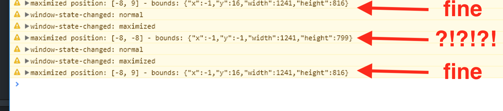 WinKey + Up Arrowyou’ll notice this pattern in the logs:Note that we’re only listening to these window change events, and I don’t think we’re setting these bounds anywhere.