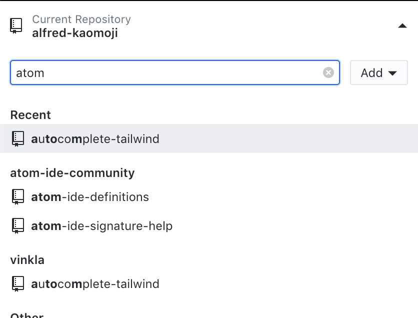 atom-ide-definitionsrepository. Though, I’ve recently worked in theautocomplete-tailwindrepository. When I filter “atom” it returnsautocomplete-tailwindbeforeatom-ide-definitions. I would expect it to list theatom-*repositories first.Example 2