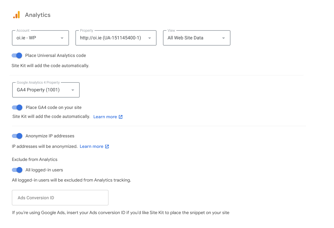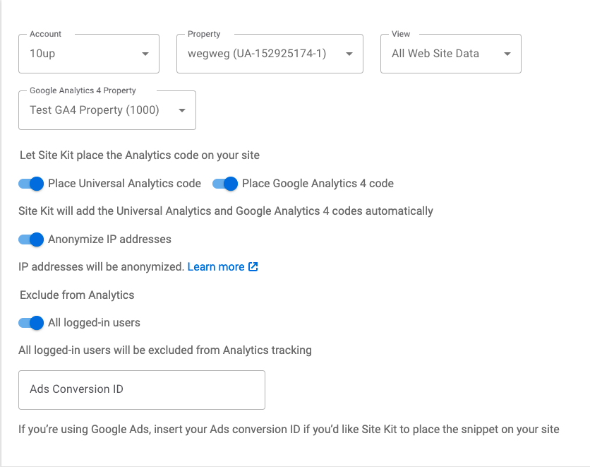 - Activate the GA4 controls by clicking on the appropriate toggle beneath the disabled dropdown. It should activate the dropdown and automatically select the following values: