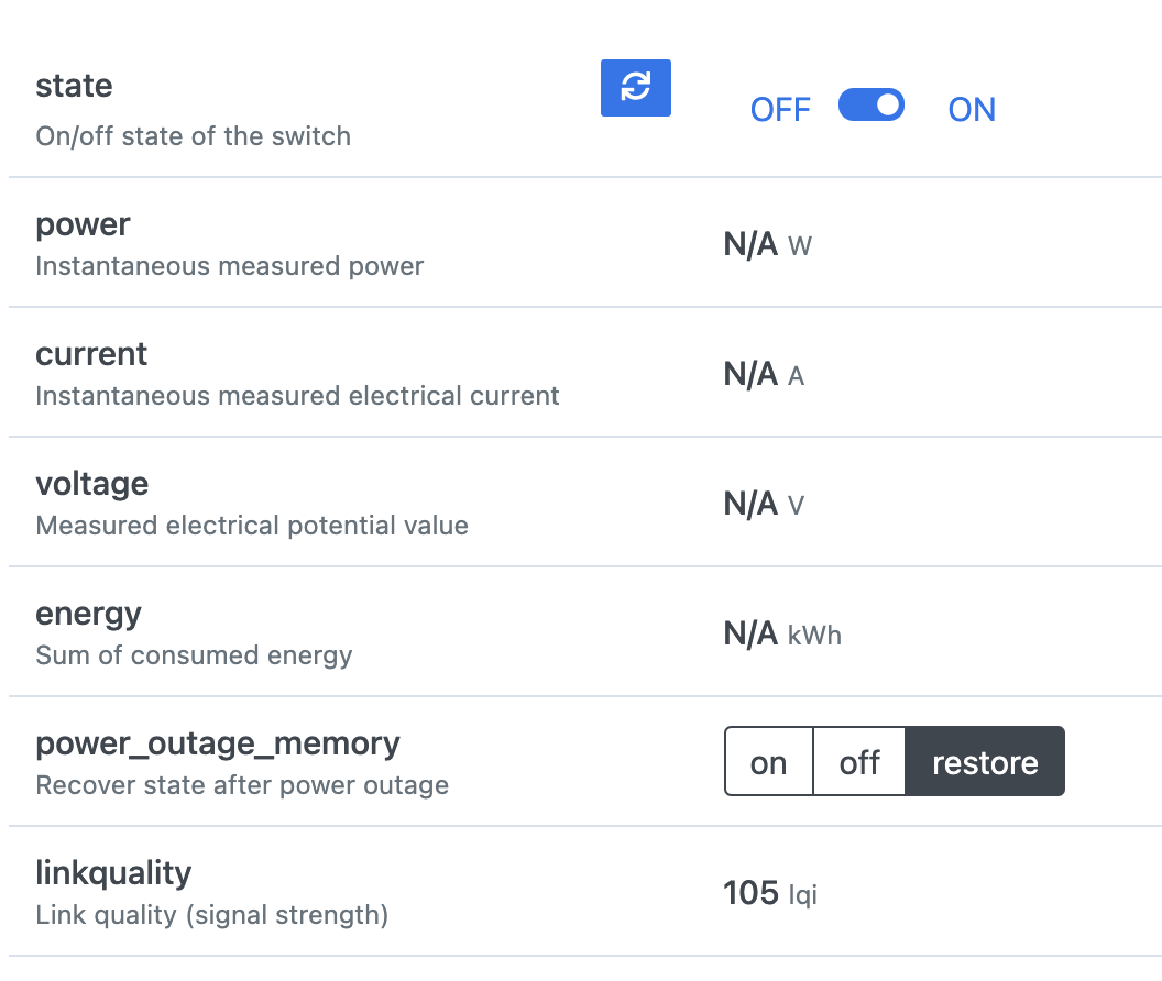 Zigbee2MQTT:info 2021-06-06 18:12:57: MQTT publish: topic 'zigbee2mqtt/0x84fd27fffe3e25a8', payload '{"current":null,"energy":null,"linkquality":105,"power":null,"power_outage_memory":"restore","state":"ON","voltage":null}'