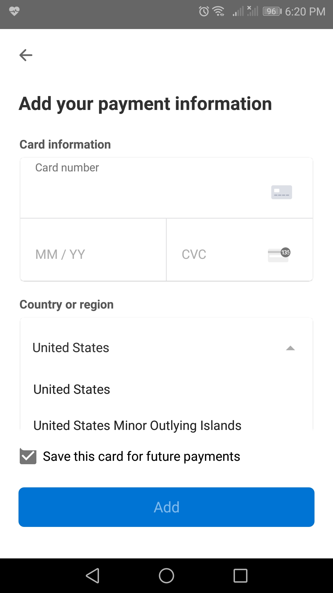 Payment sheet only displays "United States" in the "Country or Region" dropdown