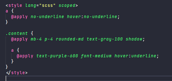 Weird coloring and `@apply` issues in SCSS files (or in Vue SFCs)