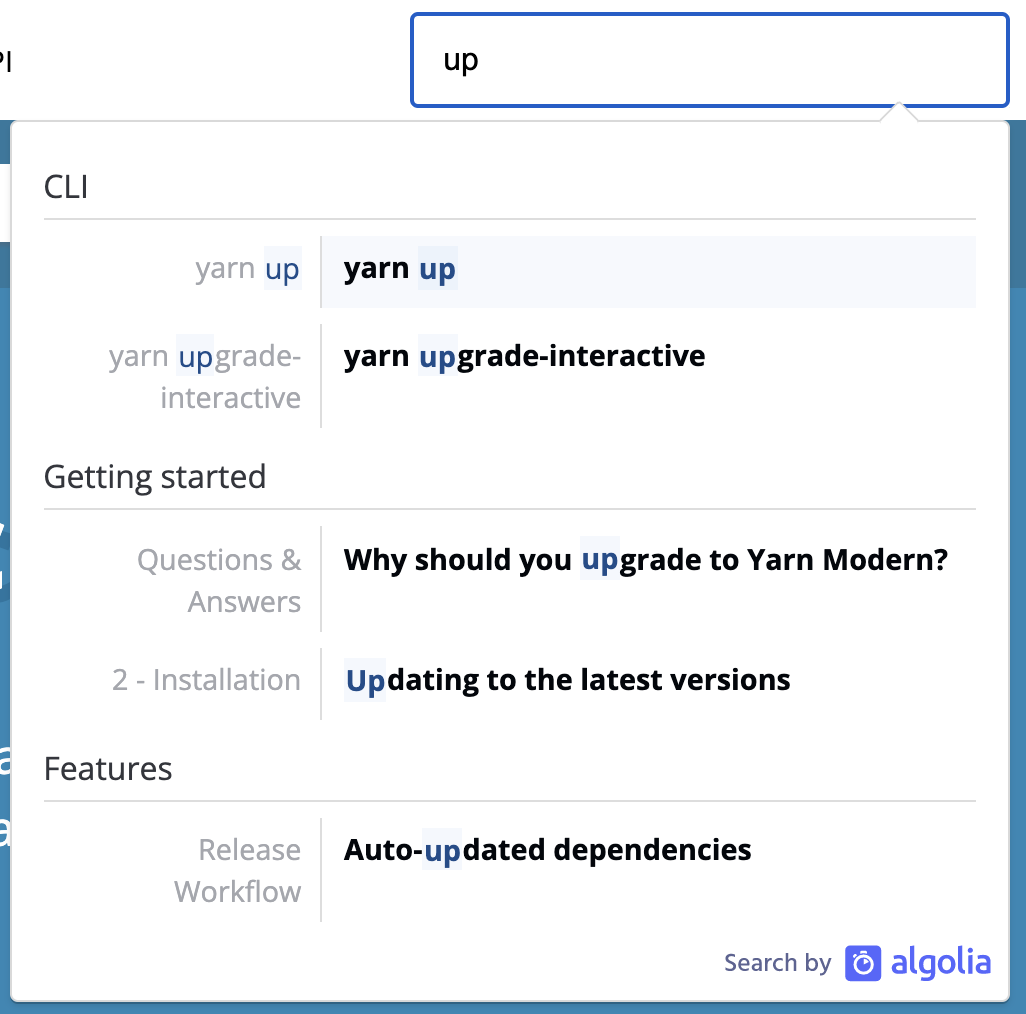 When searching the Yarn 2 documentation for “upgrade”, the results should include yarn up (CLI).