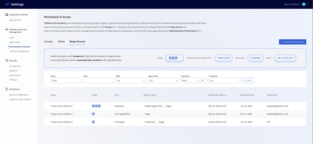 The Lightrun platform fully supports JIT (Just-In-Time) access in addition to its comprehensive suite of security features, including SCIM, RBAC, and Agent Pools. The JIT access feature is enabled through a public API, facilitating seamless automation and integration with internal systems. It is also accessible via the Lightrun management portal (as shown in the screenshot below). Within the management server UI, Lightrun distinguishes between 2 access types: Administrative permissions and Platform permissions. The administrative permissions refers to the login access to the Lightrun platform, user management, and service configuration. The platform permissions that allow developers to retrieve data including Logs, Snapshots, and Metrics from the customer applications, are managed via RBAC and are subject to the JIT access.