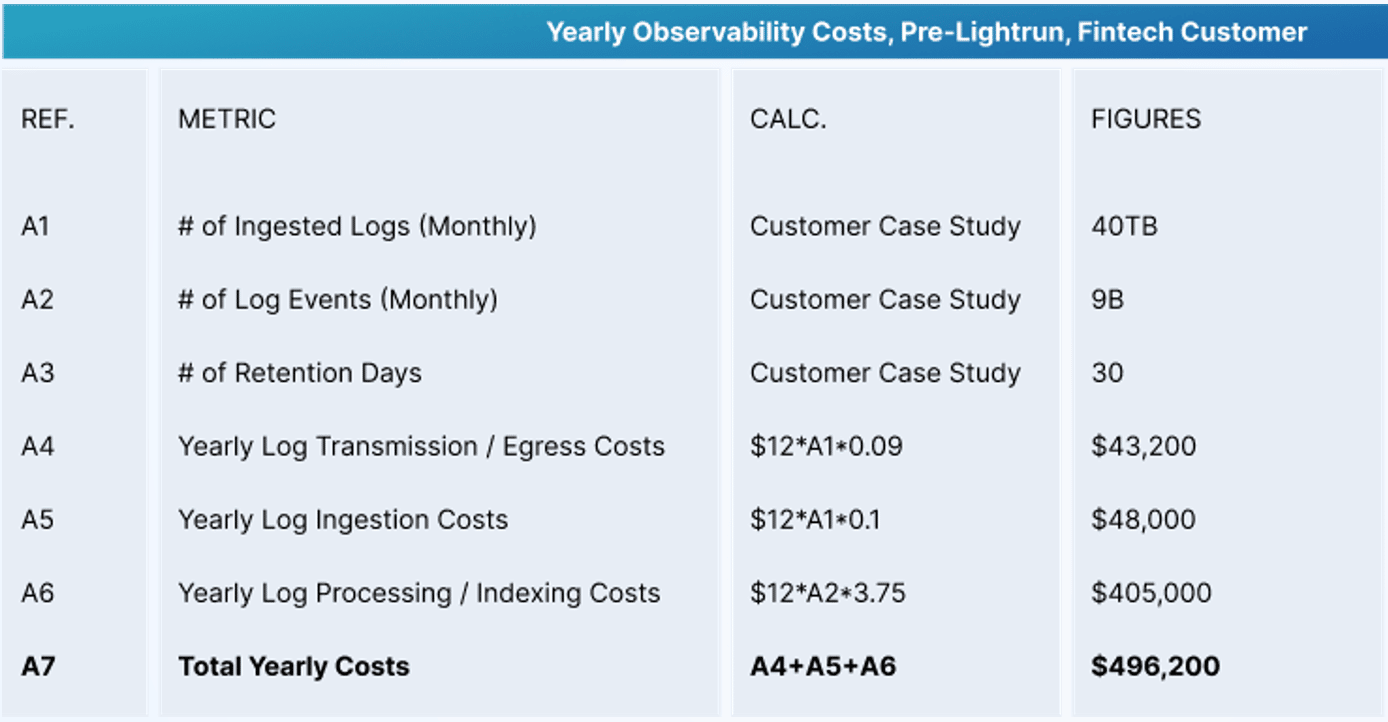 If you look at a high level calculation of logging costs adapted from a real-world observability bill, you can see the aggregated costs of scaled logs broken down according to a few different metrics: