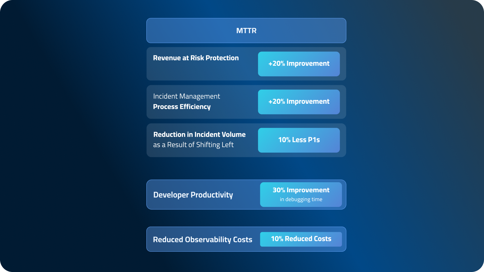 Here is a real-world example of the tangible outcomes achieved by one of Lightrun’s clients through the implementation of the platform and the strategic shift left observability. The benefits derived from this adoption can be categorized into three primary pillars: