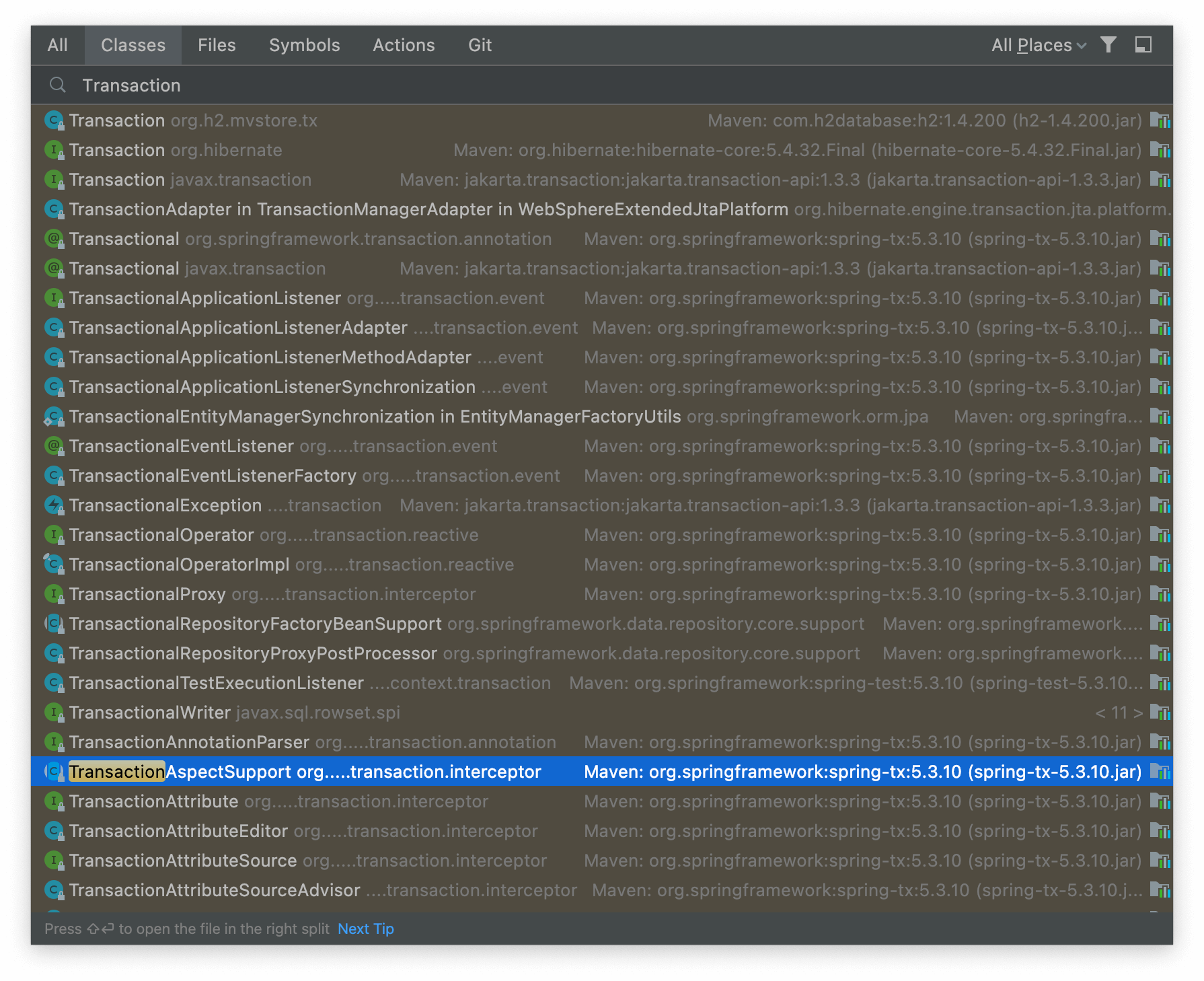 The first thing we need to do is look for the class that implements transaction functionality. Opening the IntelliJ/IDEA class view (Command-O or CTRL-O) lets us locate a class by name. Typing in “Transaction” resulted in the following view: