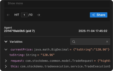 Connect directly to remote environments from your IDE and capture runtime data on demand. Inspect execution paths, variables, and logic under live traffic without changing code.