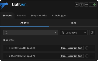 Select a running service from the IDE and dynamically inject logs, snapshots, or metrics without needing to redeploy.