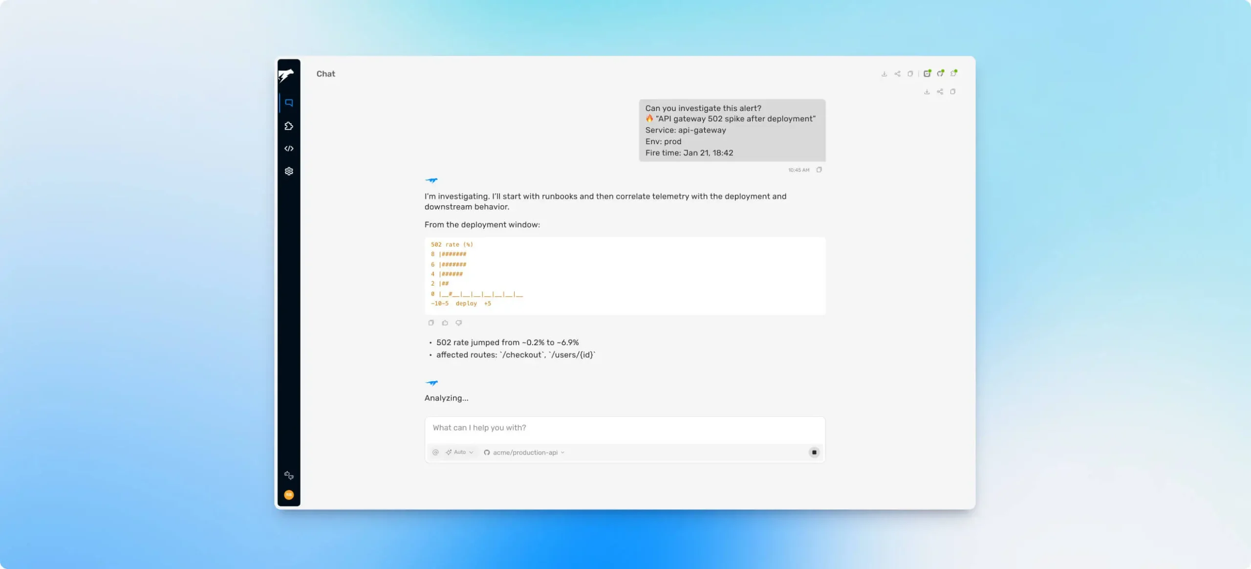 It correlates runtime evidence with code and infrastructure changes to prove the exact source of the issue.