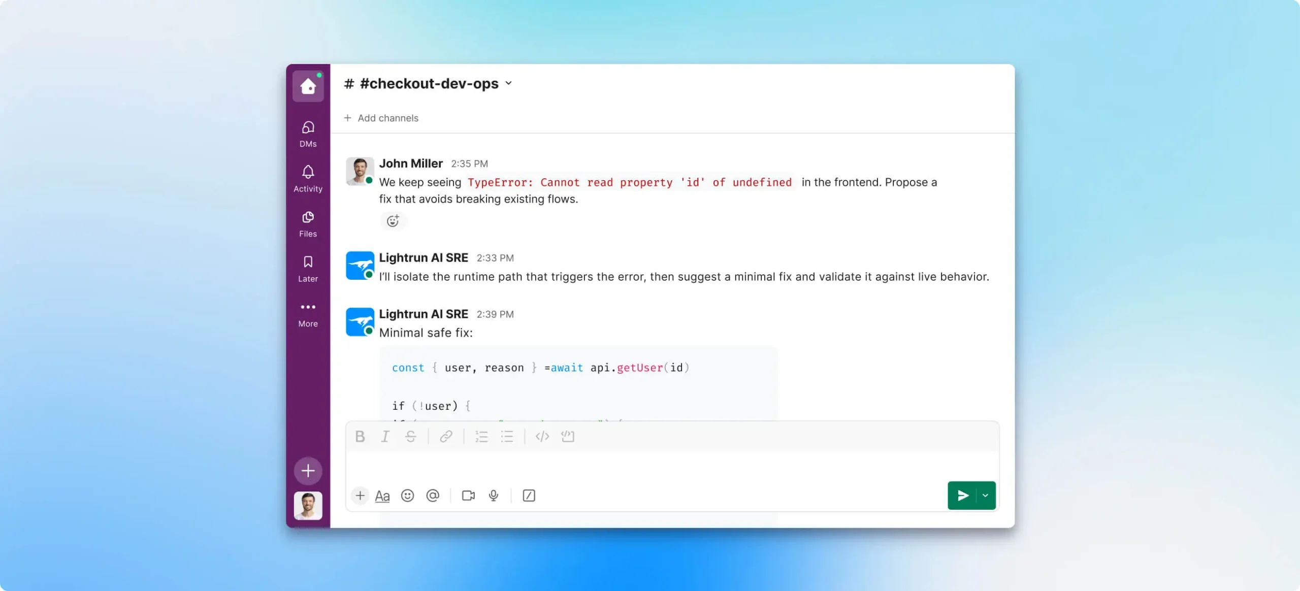 On alert, Lightrun inspects live execution and generates runtime evidence at the failure point.